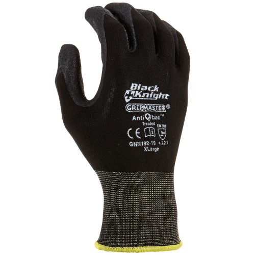 Black Knight Gripmaster gloves have Multi-layered Gripmaster technology that prevents oil penetration while repelling water ensuring excellent grip with other surfaces. Anti-Bac anti-microbial treatment provides protection against harmful bacteria and an odor barrier. There are no streaks on the inside of the glove that could cause irritation or heat build-up. Machine washable prolongs the life of the gloves without compromising the effectiveness of the Anti-Bac treatment. 13-gauge lycra/nylon provides elasticity, snug fit, and breathability. The thin coating provides excellent flexibility and dexterity, which does not restrict hand movements, and enables to feel the touched surfaces. Certified according to EN388: 2016, rating 4131X.